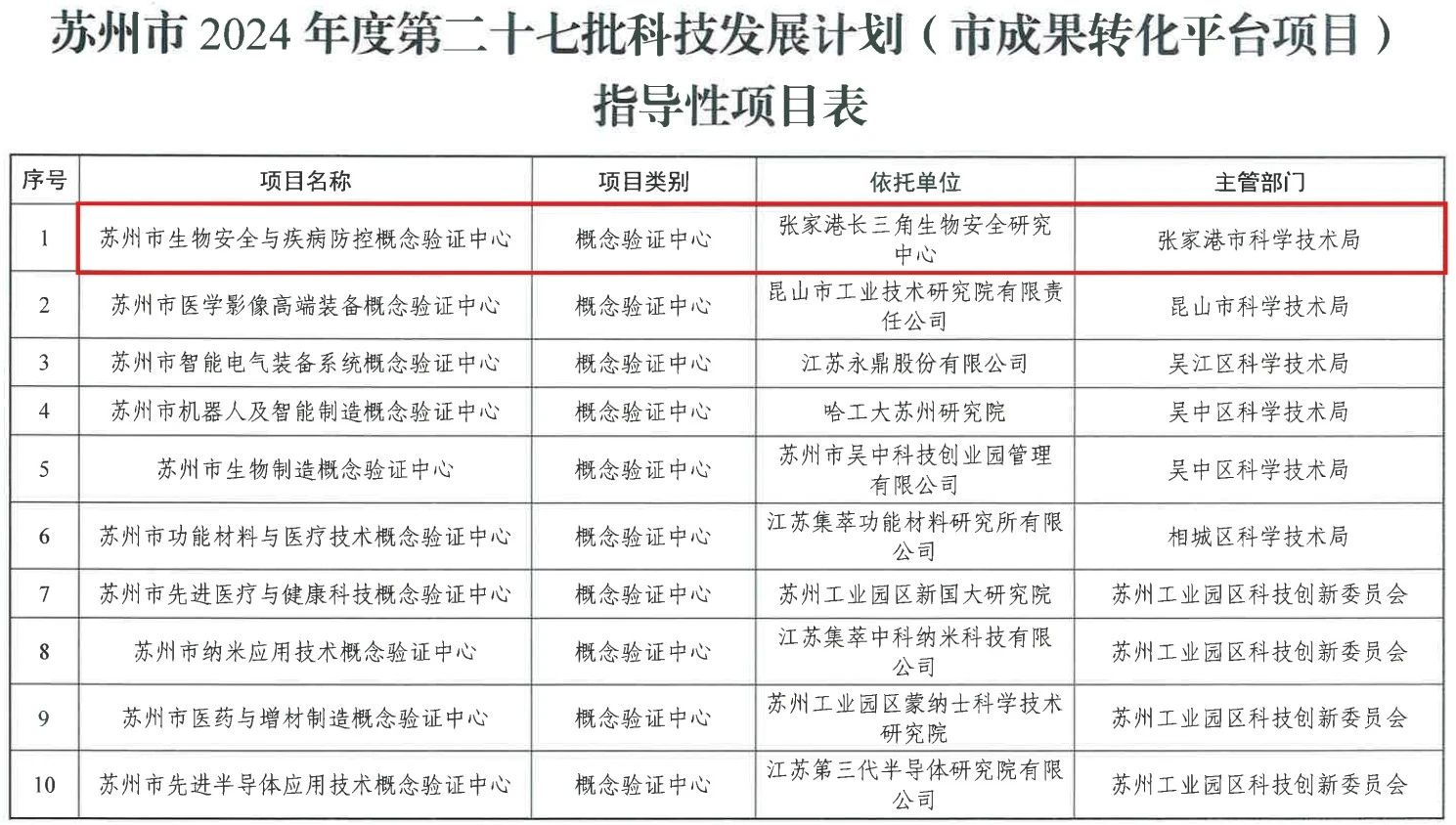 响应政府加快布局建设一批概念验证、中试验平台的号召,生安中心建设的“苏州市生物安全与疾病防控概念验证中心”入选苏州市2024年度概念验证中心,成为张家港市首家,也是唯一入选苏州市概念验证中心的单位。